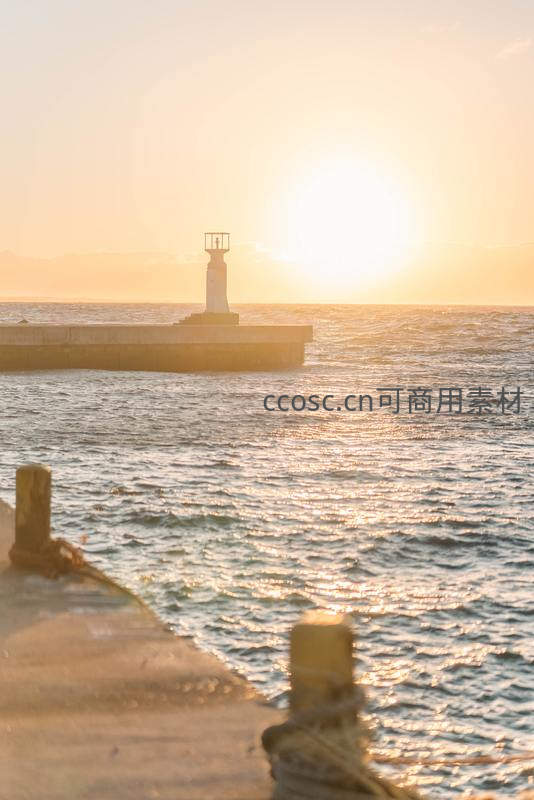 夕阳西下,金色阳光洒满海面,远处灯塔静静伫立在码头尽头,波光粼粼的海水与温暖色调营造出宁静祥和的氛围。