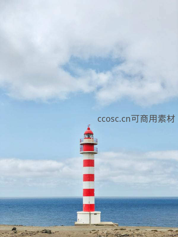一座醒目的红白条纹灯塔孤独地伫立在海岸边,背后是广阔无垠的蓝色海洋与飘逸的白云,构成一幅宁静而壮丽的海滨画卷。