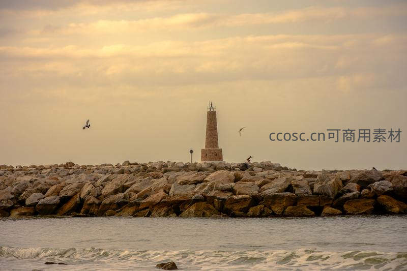 金色的夕阳洒满海面,古老的石质灯塔静静伫立在由巨石堆砌的防波堤尽头,几只飞鸟掠过天际,波浪轻拍岸边,充满诗意的黄昏景象。