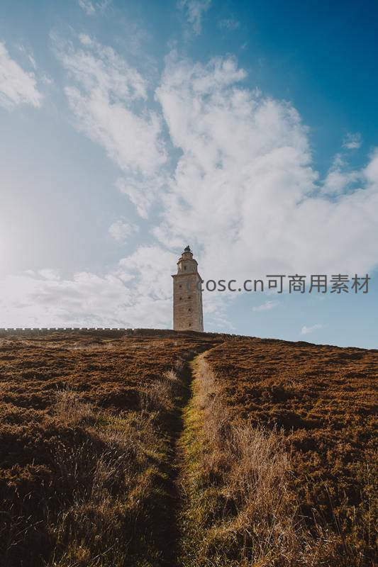 一座古老的石塔矗立在起伏的棕色草坡之上,一条蜿蜒小径通向塔底,背景是广阔无垠的蓝天与朵朵白云,充满宁静与历史感。