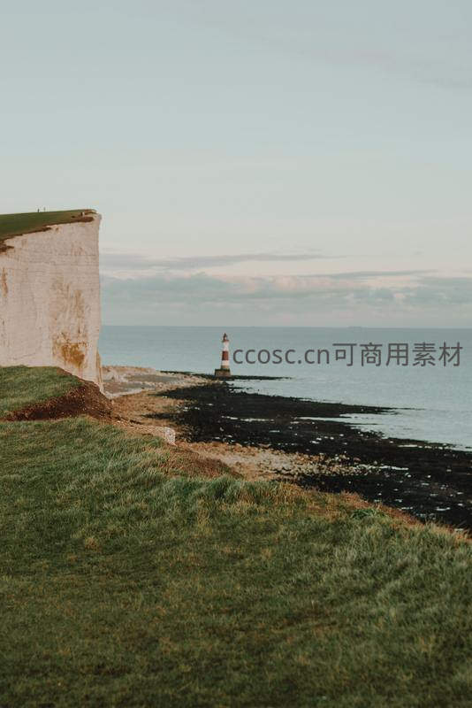 高耸的白色悬崖与远处的条纹灯塔遥相呼应,近处青草如茵,海水轻拍黑色礁石,构成一幅宁静壮阔的海岸画卷。
