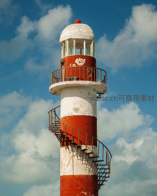 仰拍视角下,红白相间的灯塔塔身斑驳沧桑,外侧螺旋铁梯盘旋而上,背景是蓝天白云,展现工业美学与岁月痕迹。