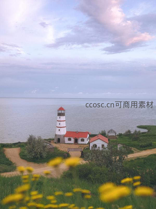 一座红顶白身的灯塔矗立在湖边绿地上,前景是模糊的黄色野花,天空云彩绚烂,整体氛围宁静而诗意。