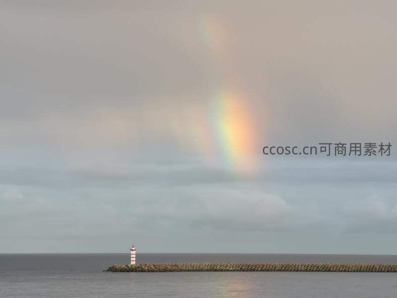 一道绚丽的彩虹横跨灰蒙天空,下方是延伸入海的防波堤,尽头处一座红白条纹灯塔静静守望,充满希望与梦幻色彩。