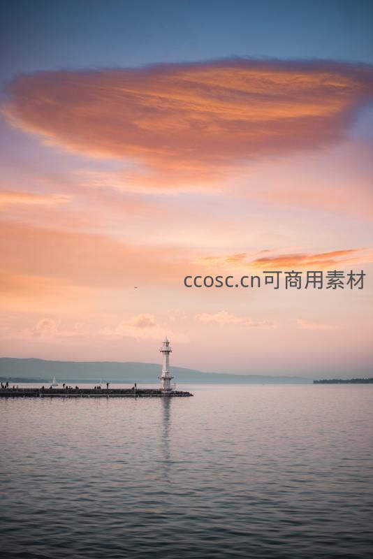 夕阳染红天边云层,一座白色灯塔静静伫立在延伸入水的码头尽头,湖面波光粼粼,远处山峦朦胧,充满诗意与平和。