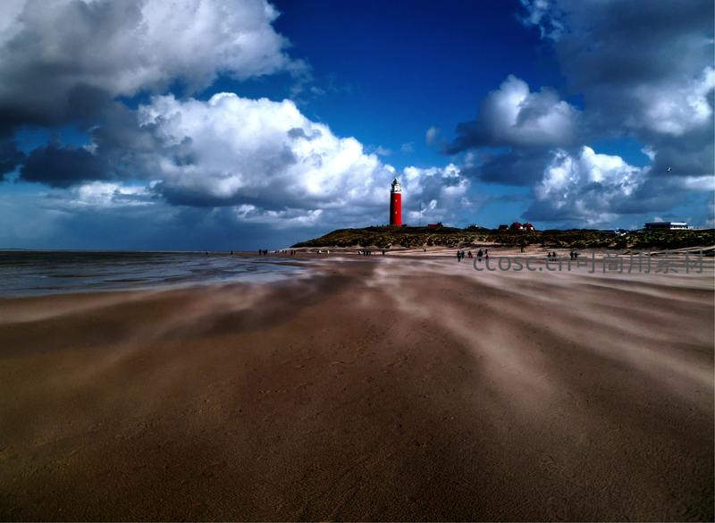 在广阔无垠的沙滩上,一座醒目的红色灯塔在蔚蓝天空与翻滚云朵的映衬下格外耀眼,人们在沙地上漫步,享受着海边的自由与辽阔。