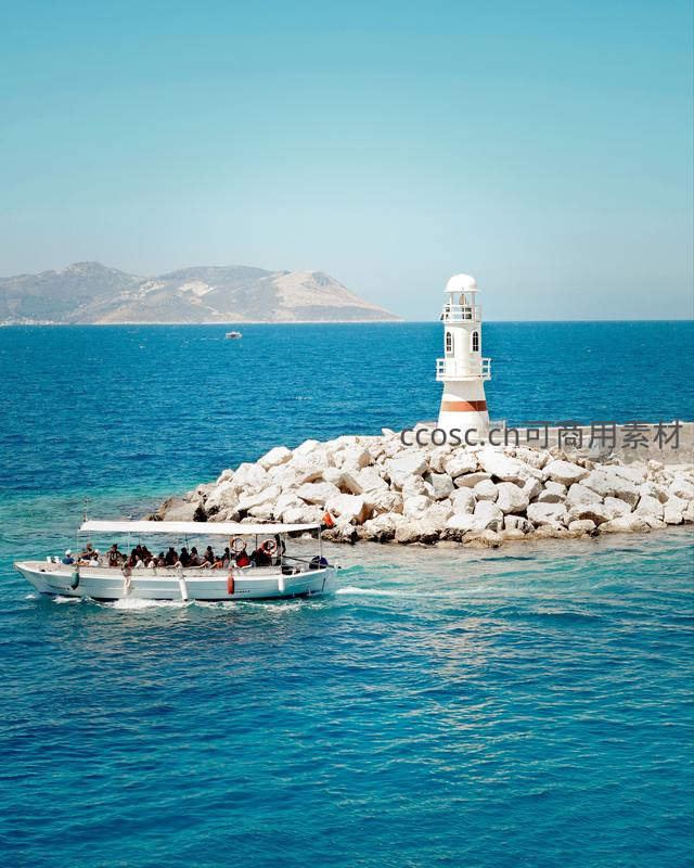 一座洁白的灯塔矗立在岩石防波堤上,蔚蓝大海中一艘满载游客的观光船正缓缓驶过,远处山峦起伏,晴空万里,充满度假风情。