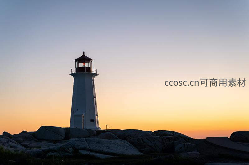一座白色灯塔在黄昏时分的柔和光线下化为剪影,矗立在崎岖的海岸岩石上,背景是渐变的橙黄与淡蓝天空,营造出宁静而壮丽的氛围。