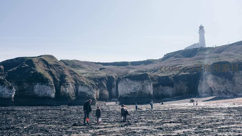 阳光明媚的午后,游客们漫步在布满礁石的滩涂上,仰望高耸于白色悬崖之上的洁白灯塔,享受着开阔海景与自然地质奇观带来的震撼。