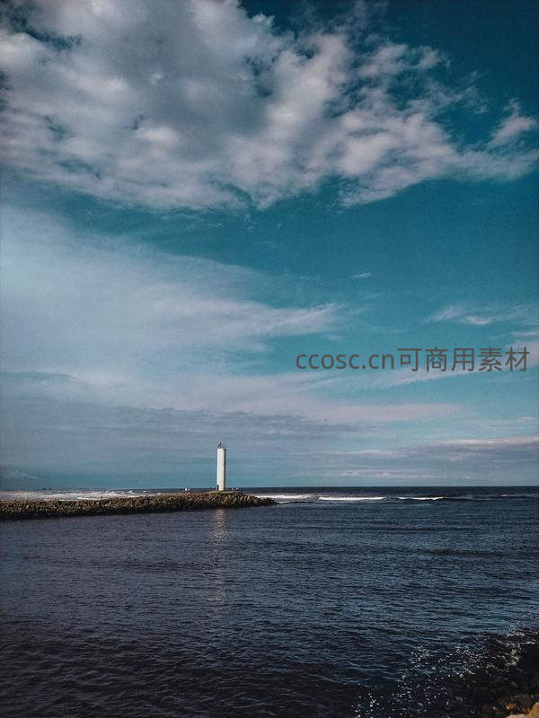 一盏白色灯塔孤独地矗立在延伸入海的堤坝尽头,深蓝色海面波光粼粼,头顶云层变幻莫测,尽显自然的苍茫与静谧。