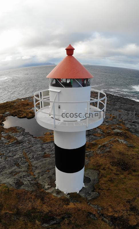 从高空视角俯瞰一座拥有红色尖顶和黑白条纹的现代灯塔,它静立于崎岖海岸,背景是无垠大海与多云天空。