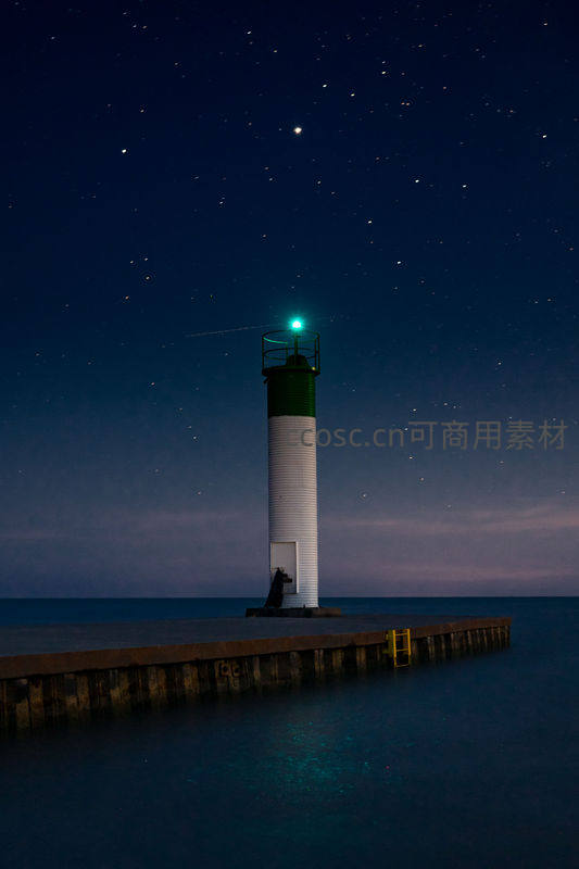 深邃夜空中繁星点点,一座绿白相间的灯塔在码头尽头发出幽绿光芒,为寂静海面带来一丝温暖与希望。