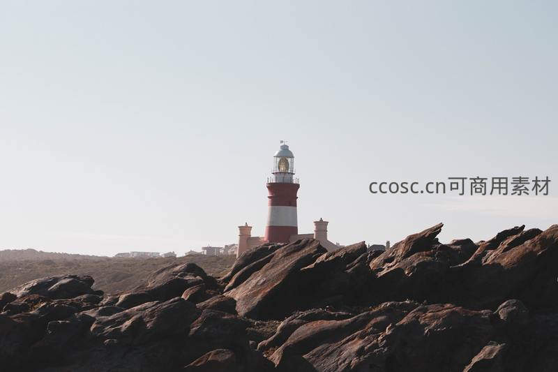 经典的红白相间灯塔巍然耸立在崎岖的黑色火山岩海岸上,背景是纯净无瑕的浅蓝色天空,展现出坚固与自然力量的和谐共存。