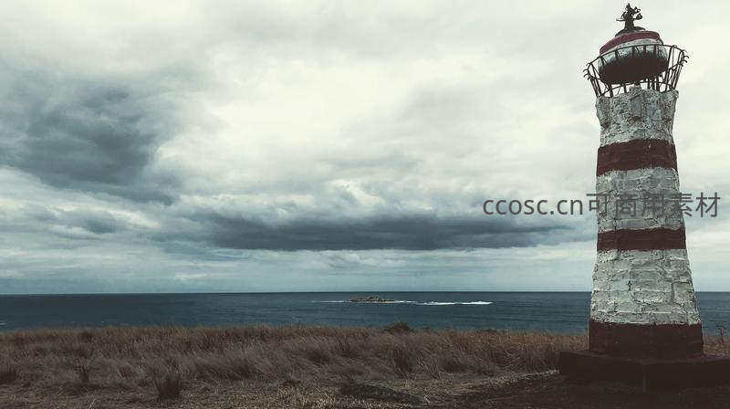 一座外墙斑驳的旧式灯塔静立于荒芜海岸,头顶乌云密布,远处海面波涛起伏,干枯草丛随风摇曳,仿佛在无声诉说时光流逝。