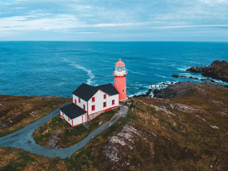 从高空俯瞰,一座醒目的红白灯塔与配套屋舍坐落在陡峭的海岸悬崖之上,碧蓝海水拍打着礁石,展现出壮丽的海岛风光。