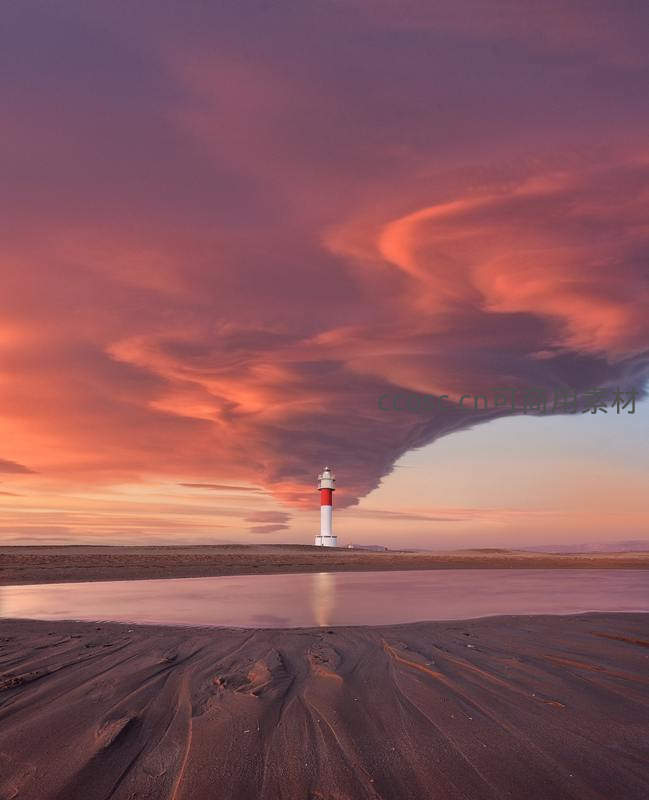 火红与紫灰交织的云层如巨浪般席卷天空,一座红白相间的灯塔静静伫立在湿润沙滩上,水洼中清晰倒映其身影,画面梦幻而富有诗意。