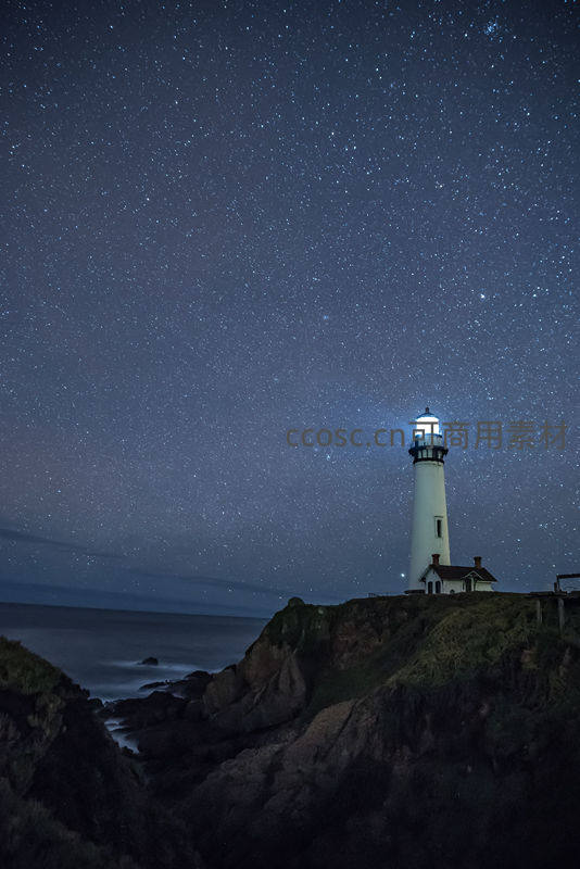 悬崖灯塔点亮夜空,繁星如钻洒满苍穹