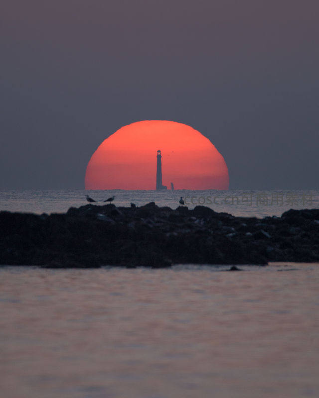 巨大的火红落日悬于海平线,将远处灯塔化为纤细剪影,前景礁石上几只海鸥静立,整个画面充满诗意与宁静之美。