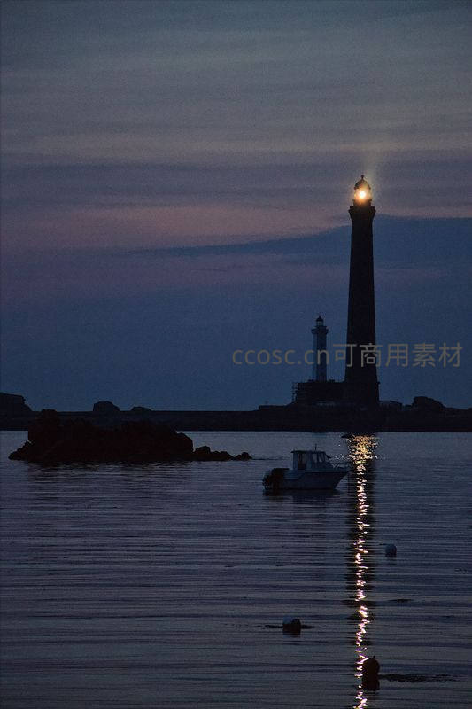 暮色四合,一座高耸的灯塔亮起温暖的光芒,其光辉在平静的水面上拉出长长的倒影。一艘小船静静停泊在近处,与远处的灯塔共同构成一幅温馨而宁静的港湾夜景。