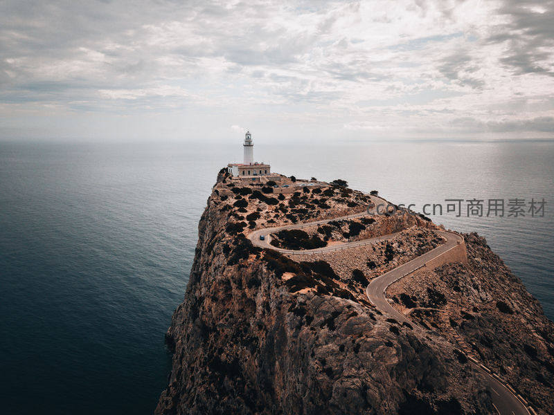 一座孤独的白色灯塔矗立在陡峭的岩石悬崖之巅,蜿蜒的公路盘旋而上,四周是广阔平静的蓝色海洋与多云天空,构成一幅壮丽的海岸风景画。