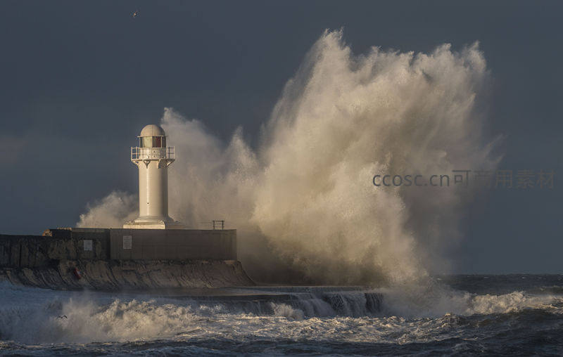 巨浪轰击防波堤灯塔