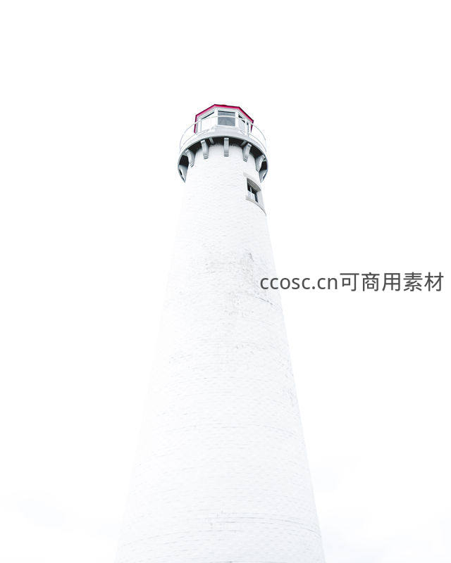从低角度仰视一座纯白灯塔,其简洁有力的线条直冲云霄,顶部红顶在纯净背景中格外醒目,突显建筑的力量感与几何美感。