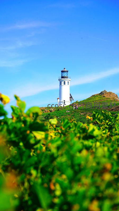 前景是翠绿茂盛的植被,远处白色灯塔静立山丘之上,背景湛蓝天空万里无云,充满清新自然的度假氛围。