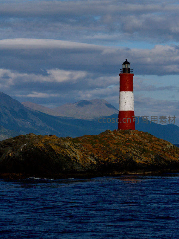 一座醒目的红白条纹灯塔傲然挺立于海边的岩石之上,背景是连绵起伏的青黛色山脉和厚重多变的云层,深蓝色的海水在脚下轻轻荡漾。