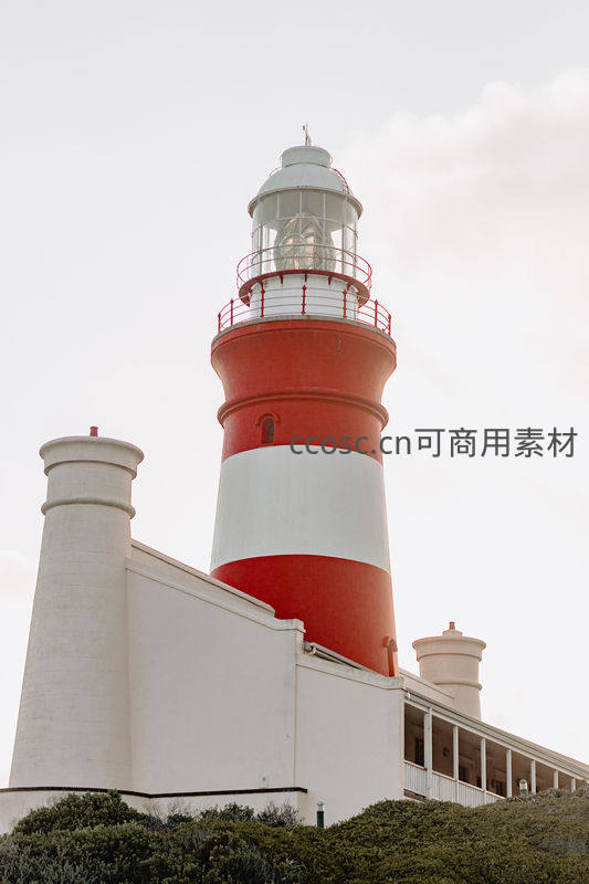 高耸的红白条纹灯塔在晴空下格外醒目,其宏伟结构与附属白色建筑构成经典海岸地标,展现工程与美学的结合。