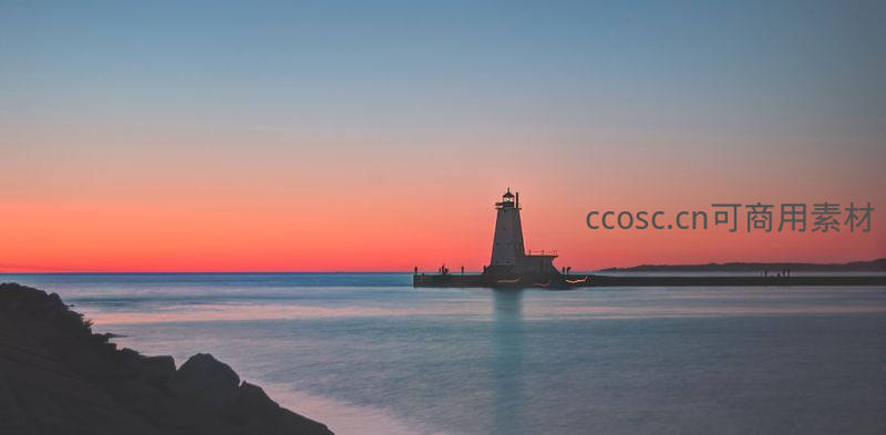 橙红晚霞铺满天际,灯塔与延伸的防波堤化为深色剪影,静谧海面泛着微光,营造出温柔而深远的意境。
