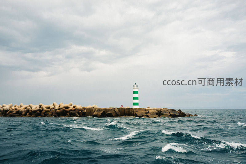 一座绿白条纹灯塔伫立在由巨大石块堆砌的防波堤尽头,面对波涛汹涌的大海,天空阴云密布,营造出苍茫壮阔的海洋景象。