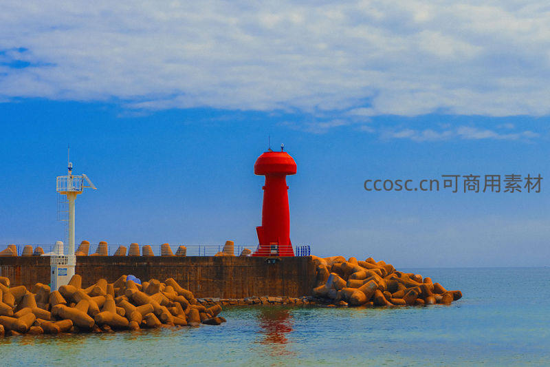 一座鲜艳的红色圆柱形灯塔矗立在由巨大混凝土块堆砌的防波堤尽头,背景是清澈的蓝天与平静的海面,象征着安全与指引。