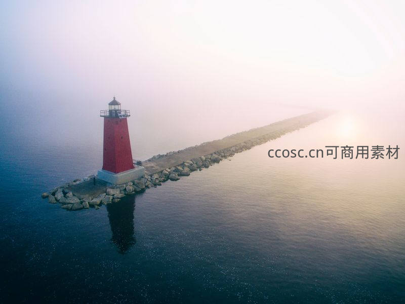 浓雾弥漫的清晨,一座鲜红的灯塔矗立于伸入海中的石堤尽头,宛如迷雾中的指路明灯。平静的水面倒映着塔身,远处阳光穿透薄雾,营造出如梦似幻的仙境氛围。