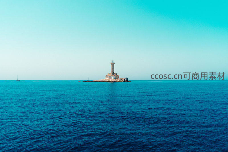 在无垠的蔚蓝大海中央,一座孤零零的灯塔矗立于小小的礁石之上,头顶是清澈的淡蓝色天空,远方隐约可见帆船,整个画面充满了辽阔与宁静之感。