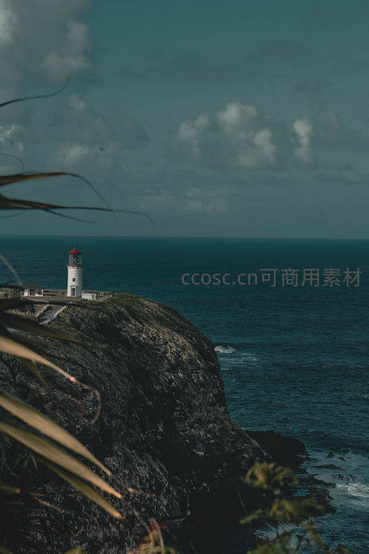悬崖之巅的白色灯塔与深蓝大海