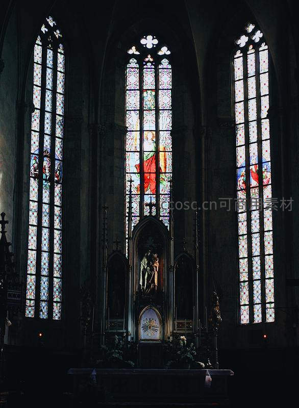 高耸的彩色玻璃窗将斑斓光线洒入幽暗教堂,中央圣像在光晕中更显神圣,展现宗教艺术与光影的完美融合。