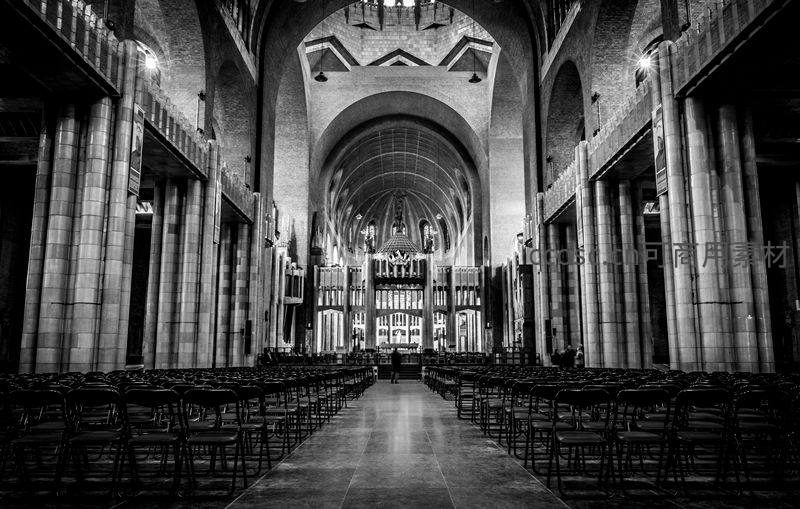 教堂内部采用黑白摄影,高耸的拱顶和粗壮的石柱营造出庄严神圣的氛围,整齐排列的座椅延伸至远方,凸显空间的深邃与宁静。