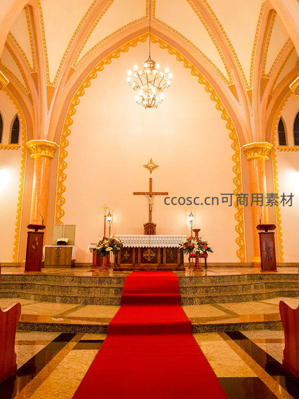 暖黄色灯光映照着精美的拱形天花板和金色柱子,鲜红地毯直通圣坛,营造出庄重而浪漫的仪式感空间。