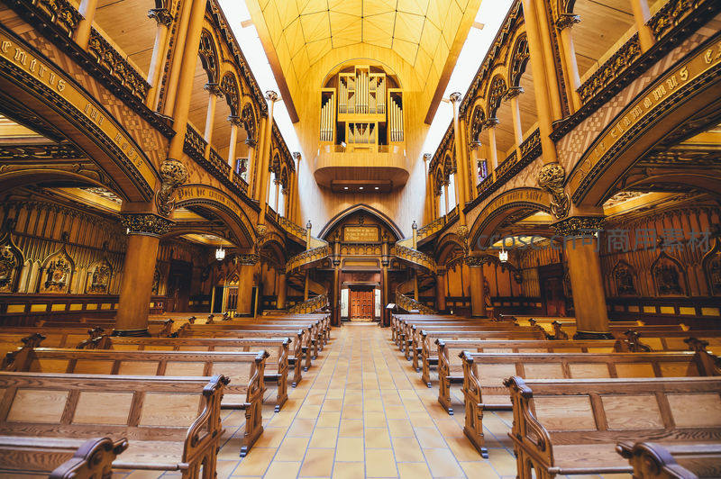 整座教堂由温润木材打造,中央高耸的管风琴与两侧回廊相呼应,阳光透过天窗洒落,充满古典音乐与信仰交融的气息。