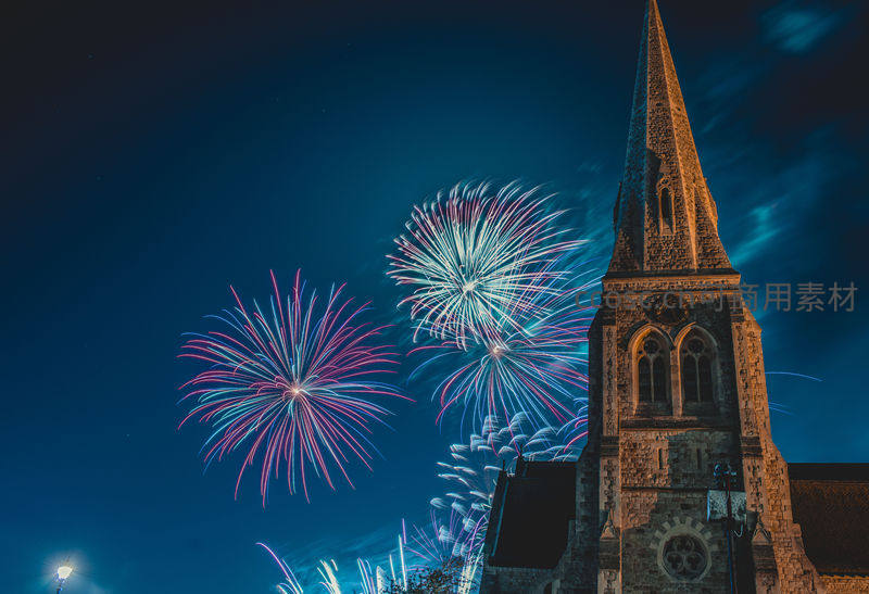 绚烂的烟花在深蓝色夜空中绽放,照亮了古老的石砌教堂尖塔,为庄严肃穆的建筑增添了喜庆与活力的节日气氛。