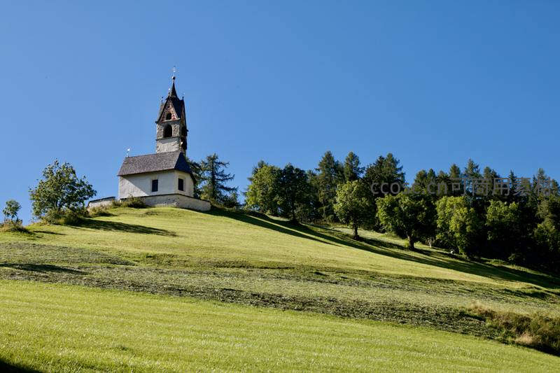一座古朴的小教堂静立于翠绿山坡之上,四周环绕着茂密的树林,晴空万里,阳光洒落,营造出一片远离尘嚣的宁静与祥和。