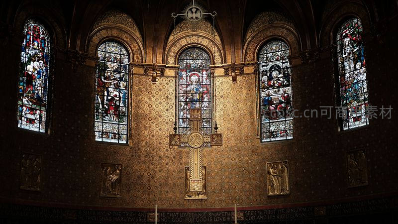教堂内墙铺满金色花纹,五扇高大彩绘玻璃窗洒下斑斓圣光,中央巨大十字架悬于墙面,营造出庄严肃穆的宗教氛围。