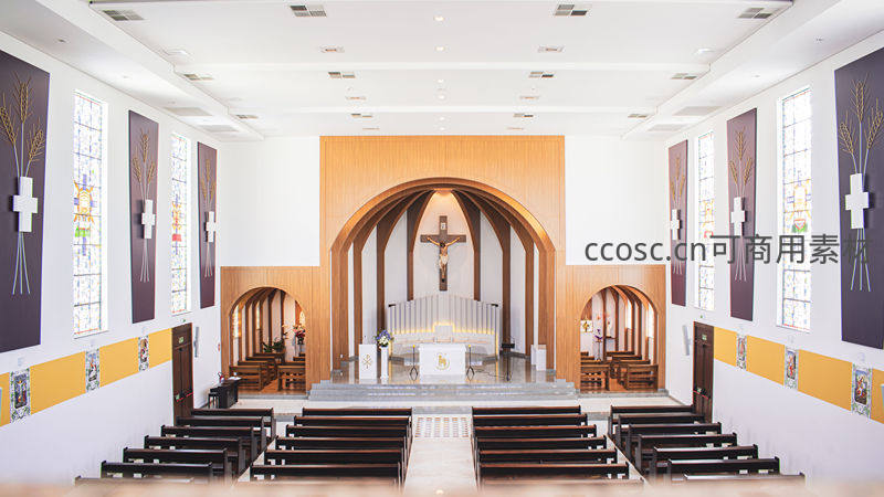 现代教堂内部全景,简洁设计与神圣氛围