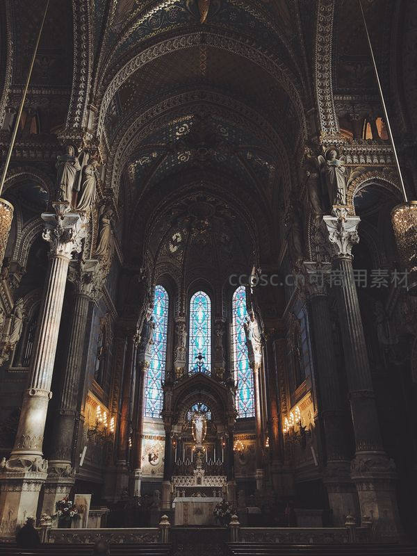 深邃的哥特式教堂内部,高耸的石柱支撑着繁复的拱顶,阳光透过巨大的彩色玻璃窗投射进斑驳陆离的光影,照亮了前方的圣母雕像和华丽祭坛,充满神圣肃穆之感。