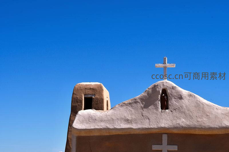 质朴的土坯教堂屋顶上矗立着白色十字架,在无垠的蔚蓝天空下显得庄严而神圣,展现了原始建筑与自然环境的和谐之美。