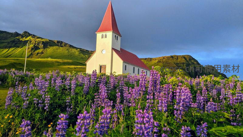 一座红顶白墙的小教堂静立于漫山遍野的紫色鲁冰花丛中,背景是青翠的山峦和多云的天空,营造出如梦似幻、充满诗意的田园风光。