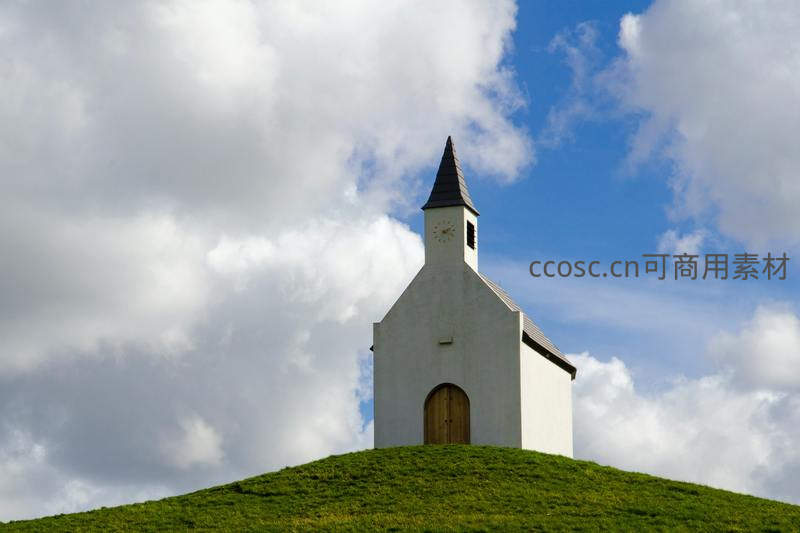 一座小巧的白色教堂独自坐落在翠绿的山丘之巅,头顶是飘动的白云和湛蓝的天空,画面极简而富有诗意,传递出远离尘嚣的宁静与安详。