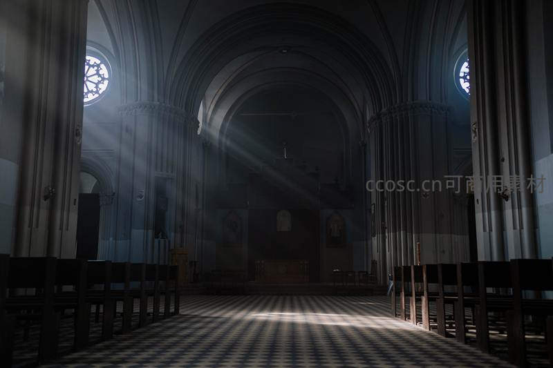 高耸的教堂穹顶下,一束束阳光如神迹般穿透彩色玻璃窗,在棋盘格地面上投下斑驳光影,营造出庄严静谧的氛围。