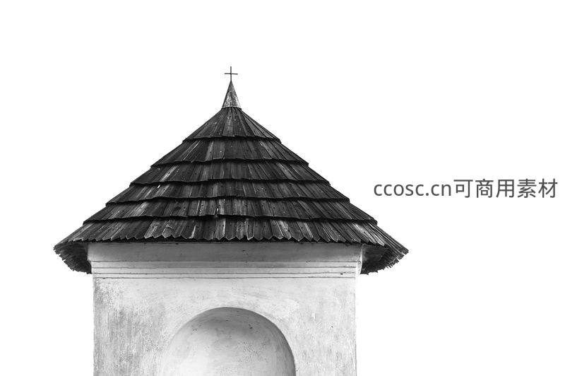 纯白背景下,一座古朴钟楼的木质尖顶和十字架以黑白形式呈现,突出其质朴纹理与几何线条,充满艺术感。