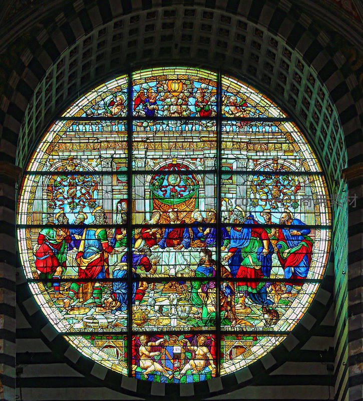 巨大的圆形玫瑰窗以精湛的彩绘玻璃工艺,生动描绘了复杂的圣经场景,人物栩栩如生,色彩绚丽,是宗教艺术的巅峰之作。